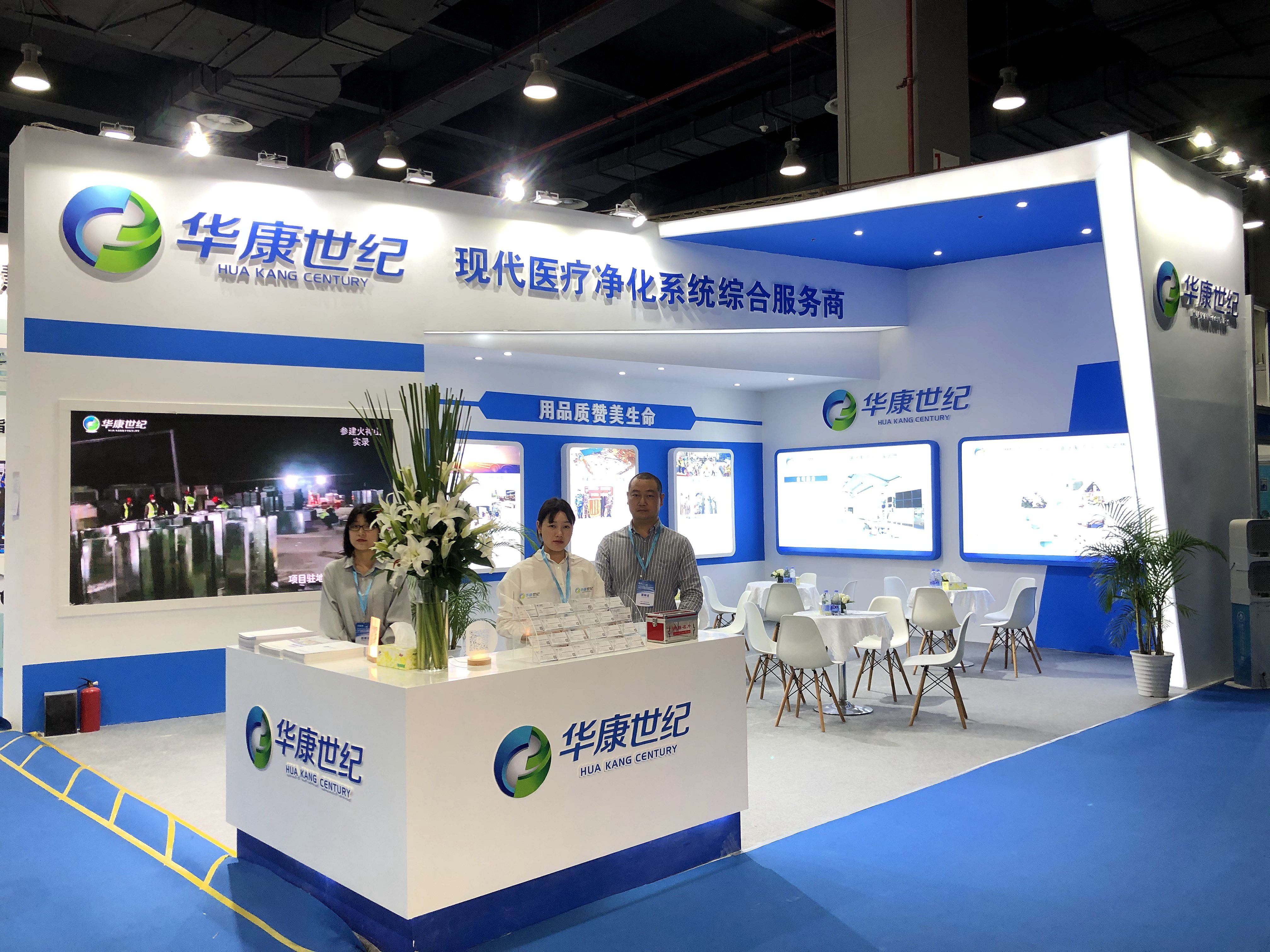 華康世紀展臺位于展會一進門第一家主展位。展區延續華康世紀藍色色調,以優雅極簡風為主,不規則的展臺突顯設計感;場景展示區以視頻+圖片、文字的形式進行企業介紹、華康世紀“抗疫(建設火神山醫院)”介紹。