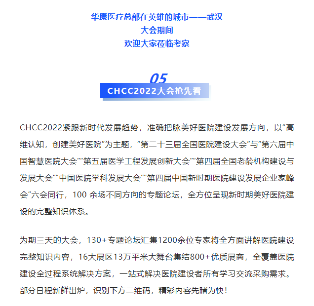 【概要描述】“第二十三屆全國醫院建設大會暨國際醫院建設、裝備及管理展覽會”(簡稱 CHCC2022)將于2022年7月23—25日在湖北·武漢國際博覽中心隆重召開。 誠邀您的蒞臨,我們在英雄的城市——武漢,等您!