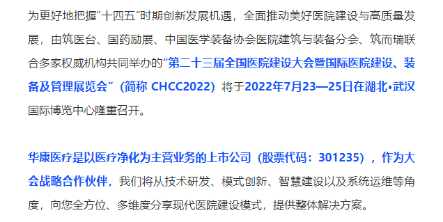 【概要描述】“第二十三屆全國醫院建設大會暨國際醫院建設、裝備及管理展覽會”(簡稱 CHCC2022)將于2022年7月23—25日在湖北·武漢國際博覽中心隆重召開。