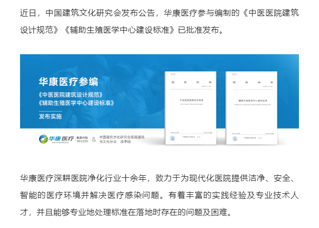 【概要描述】近日,中國建筑文化研究會發布公告,華康醫療參與編制的《中醫醫院建筑設計規范》《輔助生殖醫學中心建設標準》已批準發布。 華康醫療深耕醫療凈化領域,跟蹤行業技術前沿,在技術專利及工藝專利方面不斷形成自我特色,先后參與了30項行業標準、規范等文獻編制。