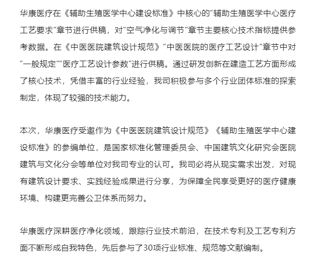 華康醫療深耕醫療凈化領域,跟蹤行業技術前沿,在技術專利及工藝專利方面不斷形成自我特色,先后參與了30項行業標準、規范等文獻編制。