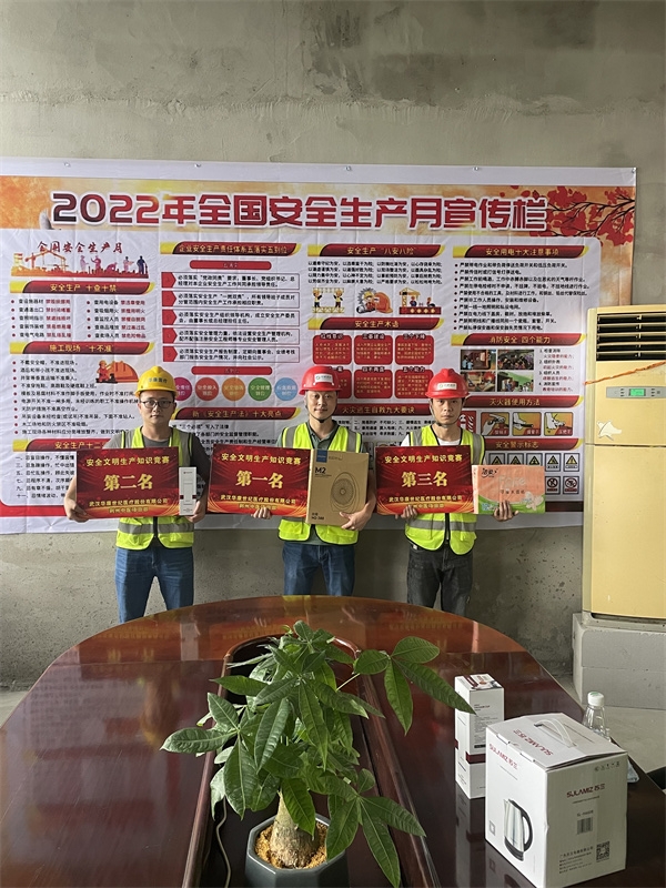 領導小組精心組織了以觀看主題視頻、應急救援培訓、消防防火演練、安全知識競賽等為主的安全生產主題活動,并為安全知識競賽與消防防火演練前三名的員工頒發獎品,還為每一位參與活動的工人都準備了一條毛巾作為紀念品,以提高工人參與的積極性。同時項目部將加大安全生產檢查整治力度,每周召開專題會議一次,每周一次例行檢查,每周兩次抽查,切實增強生產人員安全意識,杜絕安全隱患。