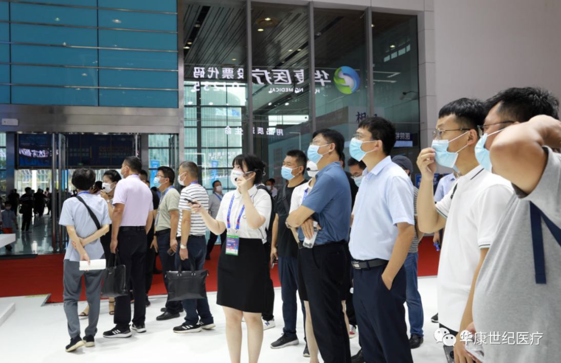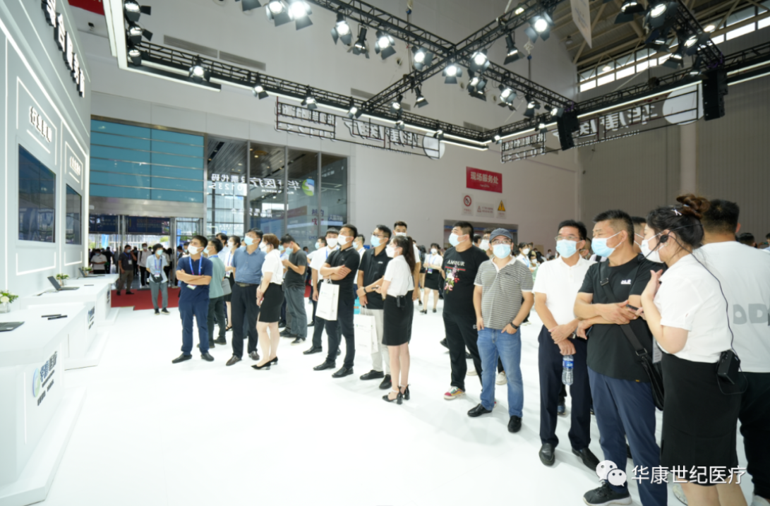 展會開幕當天便迎來密集觀展人流,華康醫療位于展館出入口最顯眼位置,會場內布置有大型廣告牌展示企業形象LOGO及理念,極具視覺沖擊力。