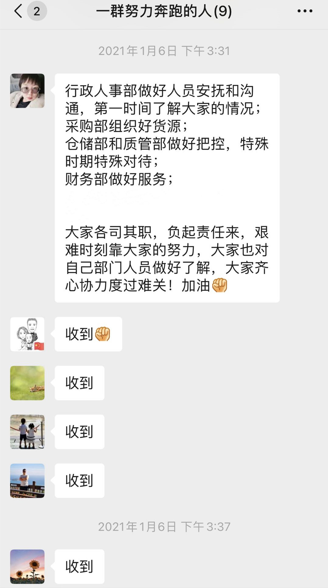 【概要描述】2021新年伊始,河北石家莊市、邢臺市成為新冠疫情中、高風險地區,河北宣布全省進入戰時狀態。疫情發生后,習近平總書記作出重要指示,中共河北省委、省政府迅速響應,部署疫情防控工作。 ? ? ? 疫情就是命令,防控就是責任。在這場驟然打響的殲滅戰中,河北華康世紀醫療科技有限責任公司(華康世紀全資子公司)作為醫療耗材倉儲配送企業,第一時間快速響應,充分集合公司力量,迅速投入到這場看不見硝煙的戰役之中,為疫情防控物資做好調撥、配送等工作。 ? 線上辦公 統一部署 因疫情防控需求,石家莊市所有市民居家隔離。隔離期間,河北華康世紀負責人祝先鋒、王晨晨迅速啟動線上“云辦公”工作模式,組織各部門召開實時會議,針對疫情期間如何確保醫療物資及時抵達進行安排部署。積極為客戶開通線上咨詢服務、疫情綠色通道等方式,做到防范疫情和優質服務兩不誤。 ? ? ? ?客服工作人員,居家隔離后全員在線,全天候24小時不間斷提供服務,對客戶需求做到第一時間響應、第一時間解決。他們離場不離崗,城市按下暫停鍵,真誠服務不停歇。 ? ? 物資配送 馳援醫院 寒冬臘月、滴水成冰。河北華康世紀收到某人民醫院的醫療物資需求,公司立刻部署,采購部同事多方聯系物資,在石家莊、邢臺各個區域交通管制情況下,河北華康世紀邯鄲區張志存、李文濤肩負起了配送的工作,他們連夜將醫療物資配送到醫院。 ? ? ? 凌晨3點的河北,氣溫零下5°,張志存、李文濤一人在車上往下卸貨、一人在車下理貨,呼出的氣立馬成了水霧,從凌晨到天亮,直至將醫院的庫房填滿。三天兩夜的時間里共配送了一萬多套防護服隔離衣及其他防疫物資,得到院方領導的充分認可。 ? ? ? ? 因河北各個物流停運派送,李文濤又駕駛車輛前往各個市區物流點提貨,再送到各個醫院以確保物資的及時供應。數九寒天,醫用物資配送的腳步沒有止步。 ? ? ? 河北石家莊的突發疫情已經持續了二十多天,河北華康世紀克服物流停運、物資進不了河北等等困難,經過多方協調,以嚴格把控著產品的質量為前提,及時為各醫院提供醫用物資的配送。 ? ? ? ? 截止目前,河北華康世紀服務全省多家醫院,保證了醫療耗材的配送與供應。并向醫院、政府一線等部門捐贈防護服、手消凝液,捐贈還在進行中。 ? ? 同舟共冀 齊心抗疫 河北華康世紀共克時艱再戰疫情 END