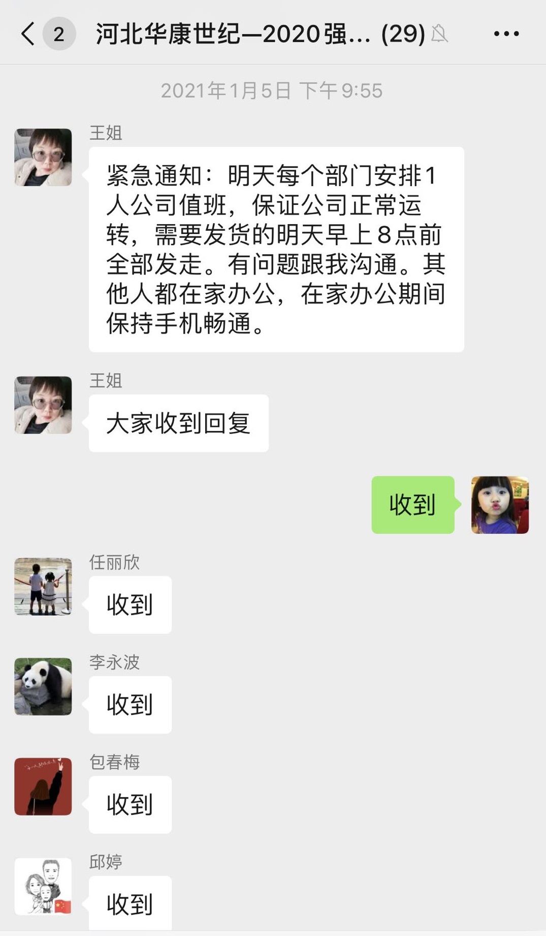 因疫情防控需求,石家莊市所有市民居家隔離。隔離期間,河北華康世紀負責人祝先鋒、王晨晨迅速啟動線上“云辦公”工作模式,組織各部門召開實時會議,針對疫情期間如何確保醫療物資及時抵達進行安排部署。積極為客戶開通線上咨詢服務、疫情綠色通道等方式,做到防范疫情和優質服務兩不誤。
